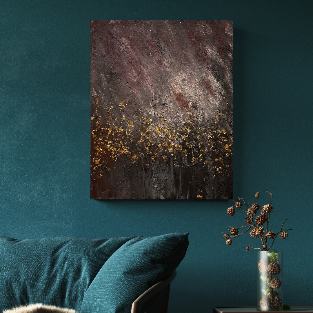 Obraz namalowany farbami akrylowymi z wykorzystaniem szlagmetalu oraz zabezpieczony werniksem. Każda praca jest unikatowa – wykonana ręcznie.